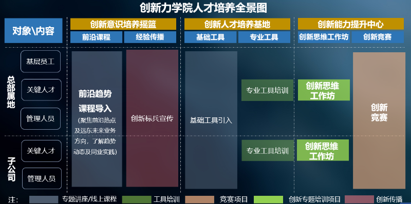 創新力學院主要負責激發員工創新精神,培育員工創新能力,聚合內外部有創意的人才借力已有的資源將“創意”轉化為“創益”,通過提供共享設施、系統培訓支持等,提升業務拓展、產品研發等創新能力和成果,提高市場競爭力。